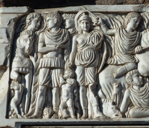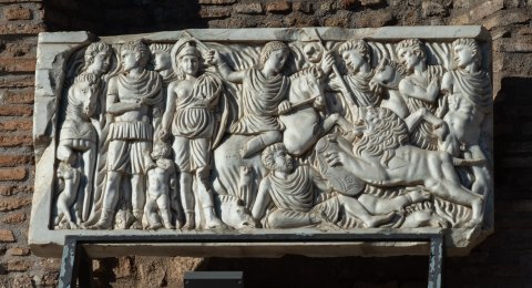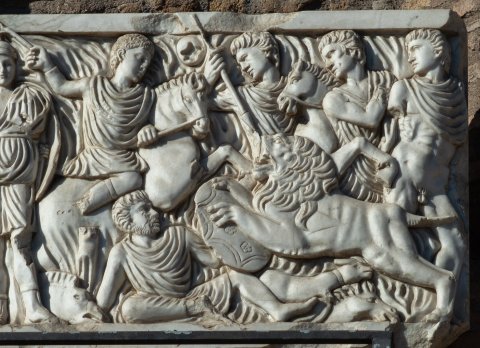- Löwenjagd. Links drei stehende Jünglinge mit Pferd, zu ihren Füßen Jagdhunde. Virtus mit Helm und Schild, unter der rechten Hand stehender nackter Gefangener, am Boden neben ihr erlegter Eber. Im Zentrum jugendlicher Reiter nach rechts, unter ihm gestürzter Jäger, vor ihm angreifender Löwe, darunter Hund, im Hintergrund drei Jünglinge mit Speer und Pferd.