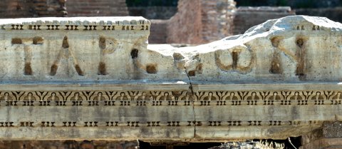 - Architrav mit Inschrift aus Metallbuchstaben, unten Fascien mit Kyma und Perlstäben