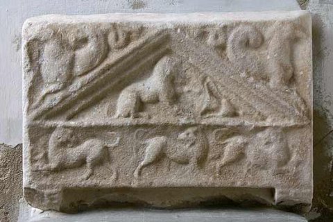 Eingeschriebener Giebel, darin sitzender Panther mit liegendem Krater, auf den Schrägen Meerwesen (Hippokamp). Im Zwischenfries Tiere (drei Panther).