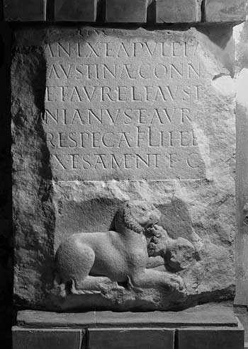- ---]INO[---]LEG / an(norum) LX et Apuleia[e] / [F]austinae con(iugi) an(norum) [---] / et Aurel(ius) Faust[i]/nianus et Aur[elia] / Respecta fili(i) her(edes) / ex tetament(o) f(aciendum) c(uravit)