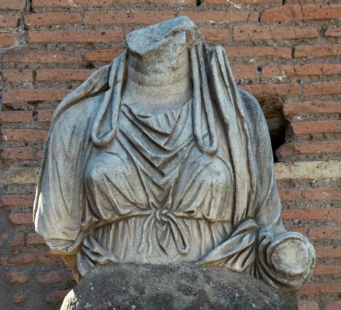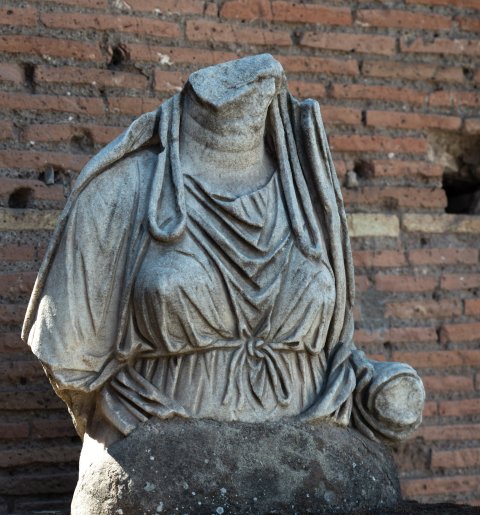 - stehende Frau (Vestalin) in hoch gegürteter Ärmeltunica und Mantel