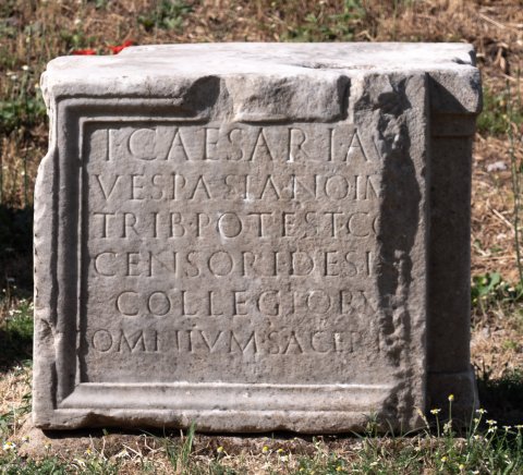 - T(ito) Caesari Au[g(usti) f(ilio)] / Vespasiano im[p(eratori) III] / trib(unicia) potest(ate) co(n)[s(uli) II] / censori desi[gnat(o)] / collegioru[m] / omnium sacerd[oti]