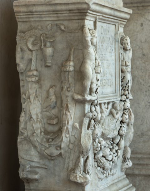 Auf den Nebenseiten Girlanden, darin unten je ein Vogel, auf der linken Seite darüber Kanne, auf der rechten Schale. Ein Ende der Girlanden hängt an den Hörnern von Widderköpfen an den Ecken zur Rückseite. Dort weiter unten jeweils ein sitzender Vogel. - Inschrift