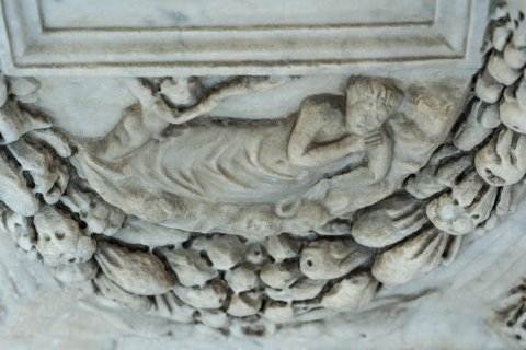 Halbrunder Aufsatz mit geschnürten pulvini mit Rosetten, im Bogenfeld Kranz mit Tänien. Auf der Vorderseite gerahmte Schrifttafel zwischen girlandentragenen Eroten, im Girlandenbogen liegender Knabe, über ihm Erot mit Fackel. Unter den Eroten Adler.