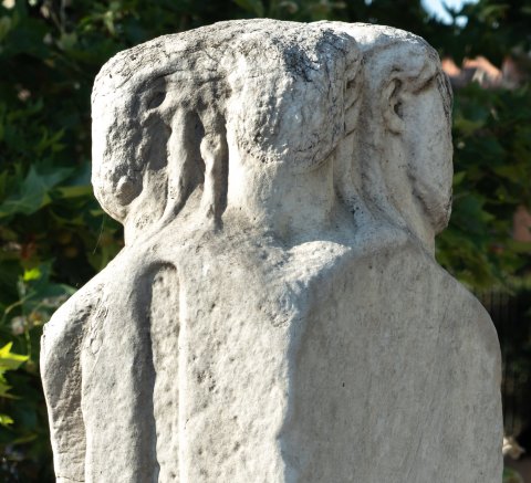 - stark verwittert, Köpfe tlw. abgeschlagen, in den Seiten Richtung Insel vertikaler Falz