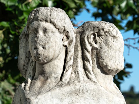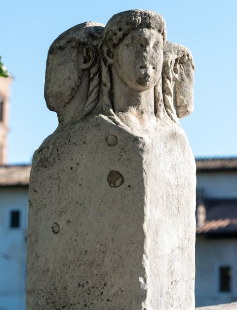 - zwei vierseitige Pfeiler, über den Ecken archaistische Frauenköpfe mit Schulterlocken (Weggottheiten)