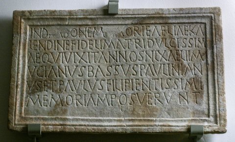 - In d(o)m(ino) bon(a)e m[e]mori(a)e Aeliae Ka/lendin(a)e fideli matri dulcissim/ae qui(!) vixit annos n(umero) LX Aelii M/ucianus Bassus Paulinian/us et Paulus fili(i) pientissimi / memoriam posuerunt