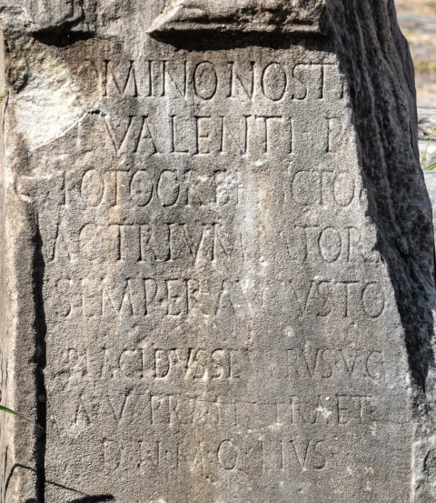 - Domino nostr[o] / Fl(avio) Valenti P(ubli) [f(ilio)] / toto orbe Victor[i] / ac triumfatori / semper Augusto / Placidus Severus v(ir) c(larissimus) / a(gens) v(ices) praef(ectus) praet(orio) / d(evotus) n(umini) m(aiestati)q(ue) eius // Petronius Maximus / v(ir) c(larissimus) iterum praef(ectus) urb(i) / curavit