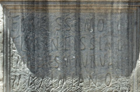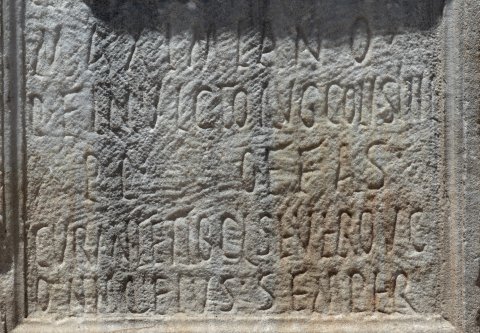 - Fortissimo ac / florentissimo / Imp(eratori) Caes(ari) M(arco) Aur(elio) Vale(rio) / Maximiano / P(io) F(elici) Invicto Aug(usto) cons(uli) IV / p(atri) p(atriae) off(iciales) a s() / curante Tib(erio) Cl(audio) Severo v(iro) c(larissimo) / d(evotus?) n(umini) m(aiestati)q(ue) eius semper