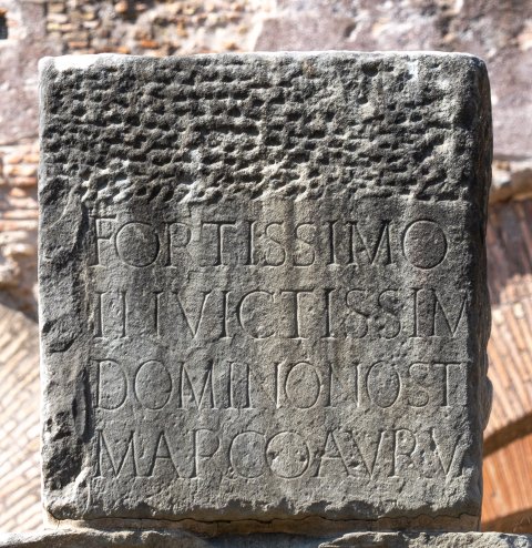 - Fortissimo [Piisimo]/ Invictissim[o principi] / domino nostr[o Imp(eratori) Caes(ari)] / Marco Aur(elio) Va[lerio] / [M]axi[mi]an[o] / [P(io) F(elici) Invicto semper Aug(usto)
