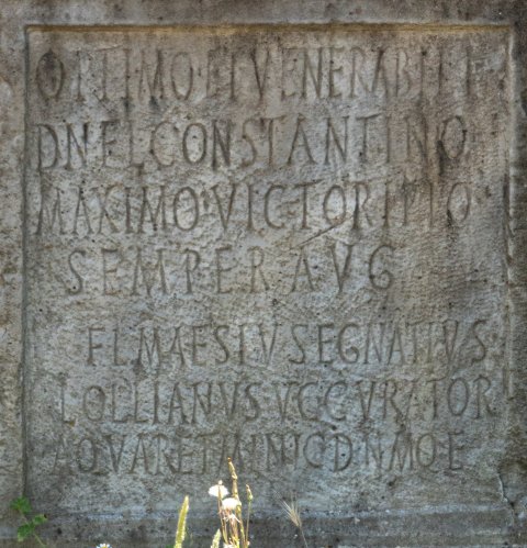 - Optimo et venerabili / d(omino) n(ostro) Fl(avio) Constantino / Maximo Victori Pio / semper Aug(usto) / Fl(avius) Maesius Egnatius / Lollianus v(ir) c(larissimus) curator / aquar(um) et Minic(iae) d(evotus) n(umini) m(aiestati)q(ue) e(ius) // dedicata cum statione / a Fl(avio) Lolliano c(larissimo) v(iro) cur(atori) / Kal(endis) Marti(i)s / Ianuarino et Iusto conss(ulibus)