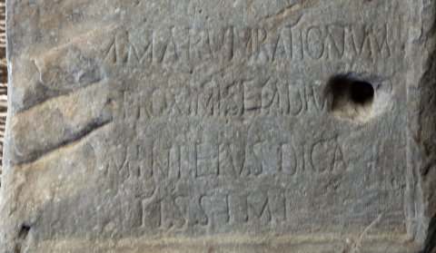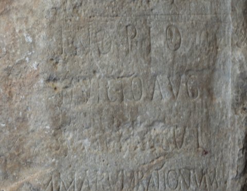 - [Magno(?) et] Invictissimo / [[[Imp(eratori) Ca]es(ari) M(arco) A[u]]]relio / [Ca]rino Pio / [Fel(ici) I]nvicto Aug(usto) / [Chre]simus tabul(arius) / [su]mmarum rationum / [cu]m proximis et adiutorib(us) / [nu]mini eius dica/tissimi