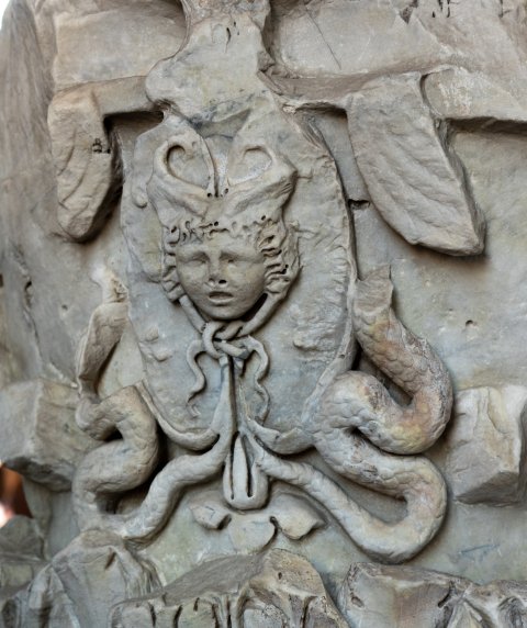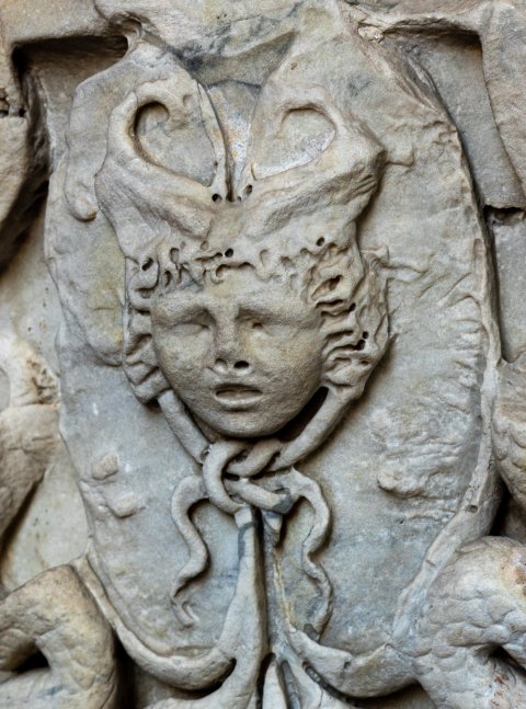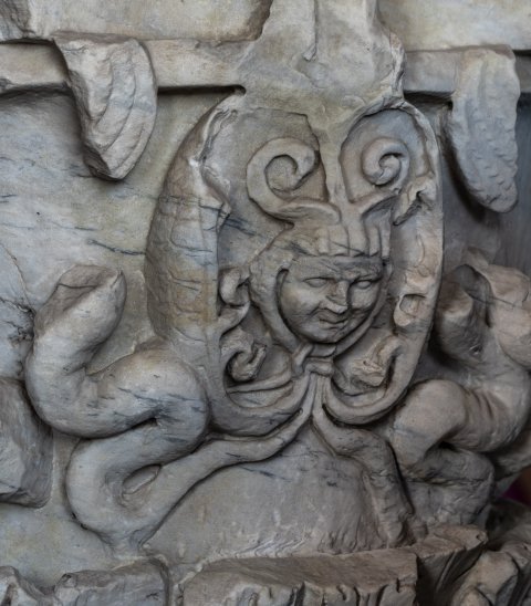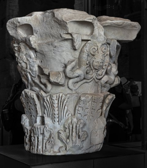- Kapitell mit zwei Blattkränzen mit unterschiedlich geformten Blättern, darüber vier Maskenköpfe mit Schlangen (Gorgoneion) in Muschelrahmen, die von Schlangen flankiert werden. Zwischen den Schlangen oben Reste von Flügeln (von Sphingen ?).