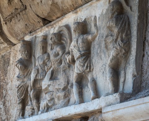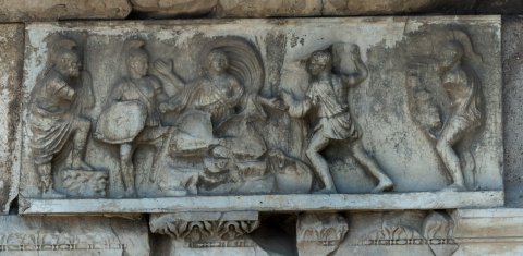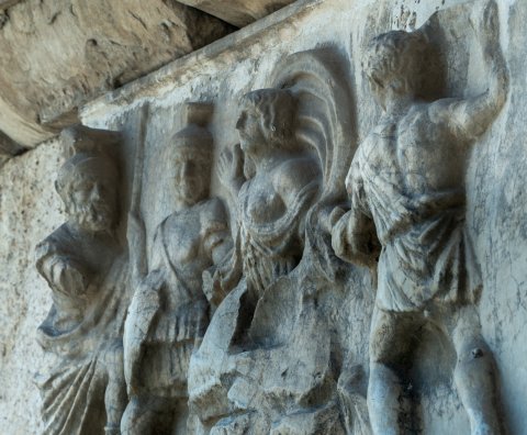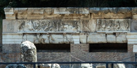 - bestoßen, versintert, aus Fragmenten zusammengesetzt; die Friesplatten aus griechischem Marmor waren in das Gebälk aus lunensischem Marmor aingelassen.
