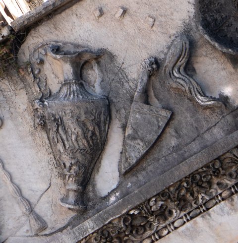 - Auf der Vorderseite gerahmtes Schriftfeld, auf der rechten Seite oben Fries mit Bukranion und Opfergeräten (Kanne, Messer, Wedel, patera, Beil, Kappe mit apex). Darunter Profilleiste mit Palmetten und Fascien mit Kymation und Zahnschnitt(auch auf der Innenseite des Gebälks).