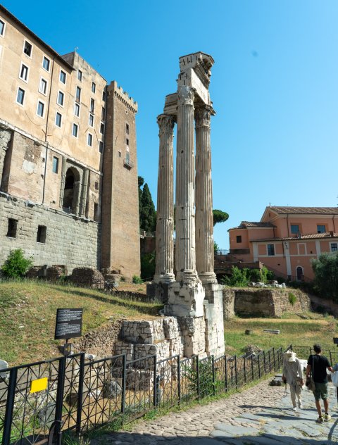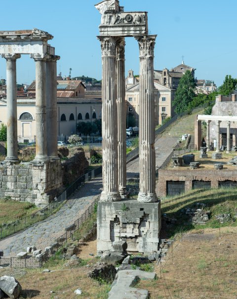 - 1811 nördliche Ecke des Pronaos mit 3 korinthischen Säulen und Epistyl wieder aufgestellt (weitere Reste des Gebälks im Tabularium)