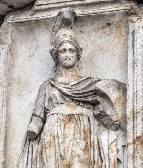 Mythische Figur: Relieffeld mit profiliertem Rahmen. Stehende Minerva mit Waffen (Helm und Schild), breiter Gürtel, Mantel mit Scheibenfibel auf der rechten Schulter.