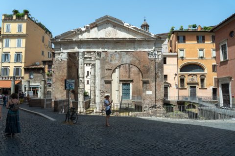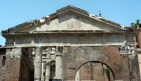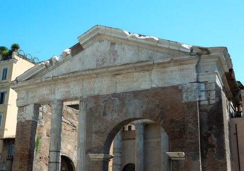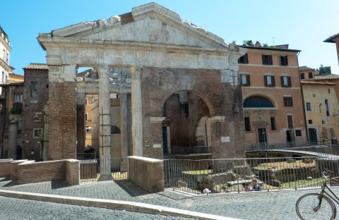 - Haupteingang zur Porticus Octaviae. Giebelfassade mit vier korinthischen Säulen. Gerahmte Inschrift auf dem Architrav.