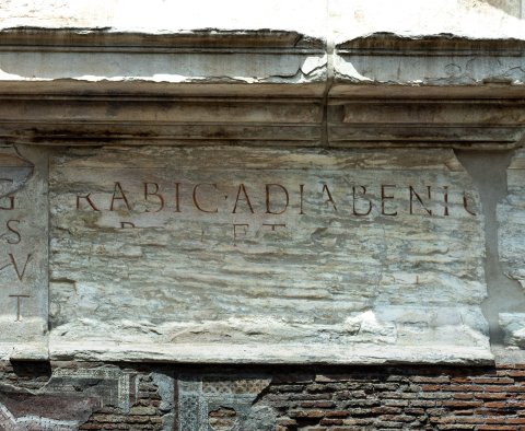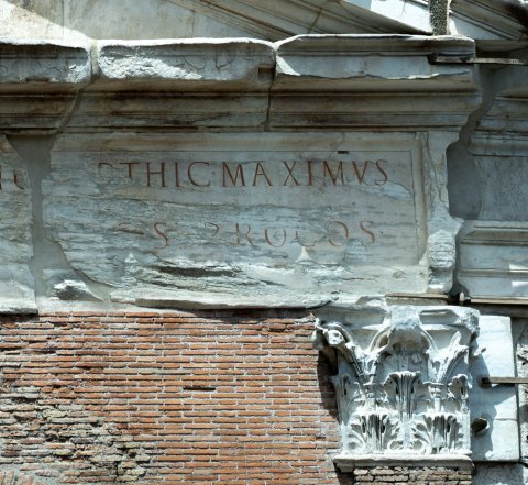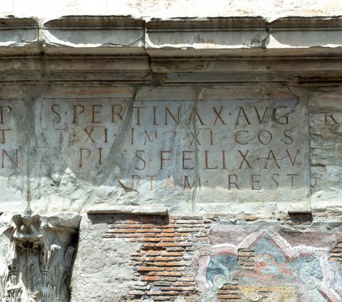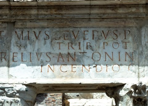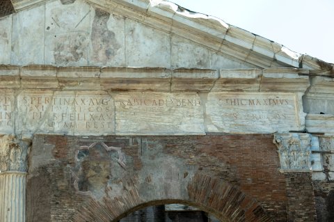 - Imp(erator) Caes(ar) L(ucius) Septimius Severus Pius Pertinax Aug(ustus) Arabic(us) Adiabenic(us) Parthic(us) maximus / trib(unicia) potest(ate) XI imp(erator) XI co(n)s(ul) III p(ater) p(atriae) et / Imp(erator) Caes(ar) M(arcus) Aurelius Antoninus Pius Felix Aug(ustus) [trib(unicia) pot(estate) VI] co(n)s(ul) proco(n)s(ul) / incendio corruptam rest[ituerunt]