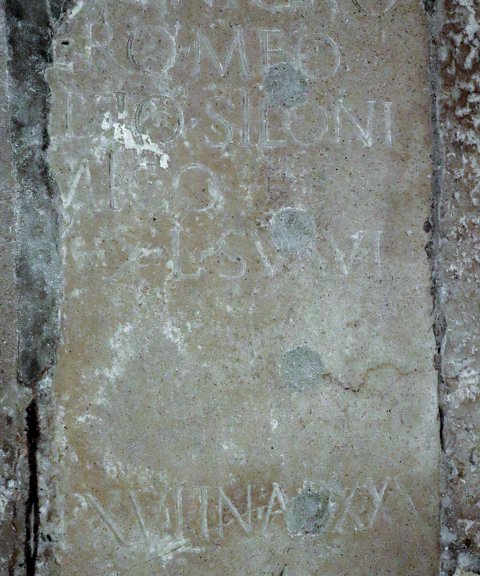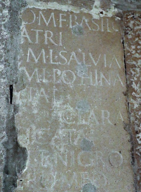 - [---]o M(arci) f(ilio) Basilo / [p]atri / [---] M(arci) l(iberta) Salvia / [---] M(arci) l(ibertae) Pothina[e] / [fi]liae / [---] Clara[e] / [de]licatai(!) / [---] L(uci) f(ilio) Nigro / [gen]ero meo / [---]idio Siloni / amico / [---] |(mulieris) l(iberto) Suavi / [in f(ronte)] p(edes) XVI in a(gro) p(edes) XXXI