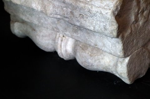 - wiederverwendeter Altar, pulvini an der Unterseite, Oberseite verbr., Eck aus der Inschriftseite heraus gebrochen
