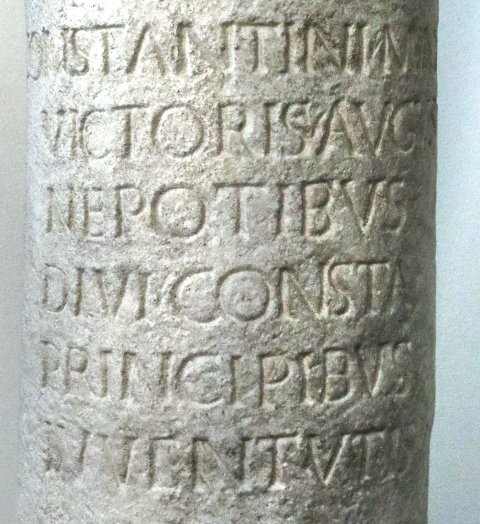 - Dd(ominis) nn(ostris) / Fl(avio) Cl(audio) Constantino et / Fl(avio) Iulio Constantio / nobb(ilissimis) Caess(aribus) / fili(i)s d(omini) n(ostri) / Constantini maximi / victoris Augusti / nepotibus / divi Consta(nti) / principibus / iuventutis