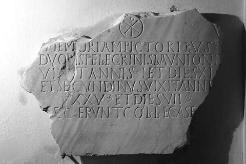 - Memoriam pictoribus / duobis(!) pelegrinis(!) Launioni / vix[i]t annis(!) L et dies XI / et Secundinus vixit anni[s](!) / XXV et dies VII / [f]ecerunt collegas(!) e[orum](?)