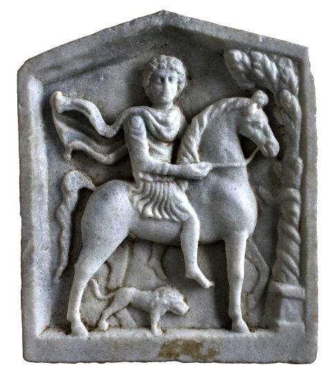 - Mythische Figur: Thrakischer Reiter mit Hund, vor ihm Baum mit Schlange.