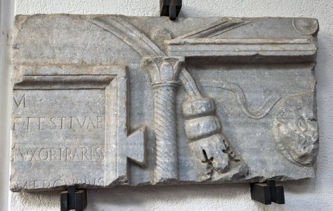 - Vorderseite mit Mittelbogen auf Säulen mit Spiralkanneluren, darunter tabula ansata mit Inschrift; rechts anschließend Giebelfeld mit Schale, darunter Girlande mit Tänien, im Girlandenbogen Maske ?