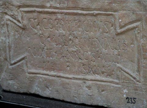 - Q(uintus) Cornificius / Q(uinti) lib(ertus) Iuvenalis / vixit annos VIIII / pie salve