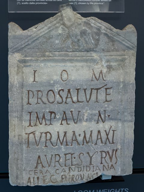 - I(ovi) O(ptimo) M(aximo) / pro salute / Imp(eratoris) Aug(usti) n(ostri) / turma Maxi() / |(centurio) Aurel(ius) Syrus / cera Candidiana / allec(tus) ex provinci[a] / [---