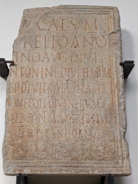 - [Imp(eratori)] Caes(ari) M(arco) / [A]urelio Anto/[n]ino Aug(usto) divi / [A]ntonini f(ilio) divi Hadri(ani) / [n]ep(oti) divi Traiani Parth(ici) / [pr]onepoti divi Nervae / [a]bnep(oti) pont(ifici) max(imo) trib(unicia) p(otestate) XVII / [c]o(n)s(uli) III r(es) p(ublica) Panhormit(anorum)