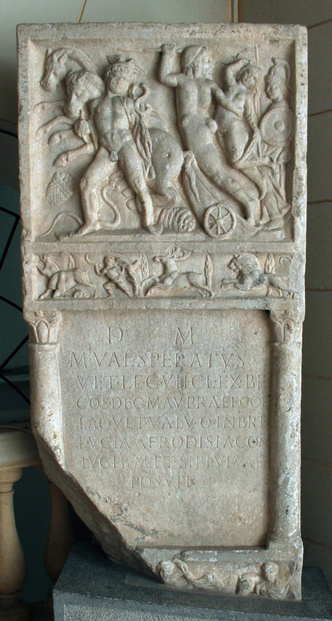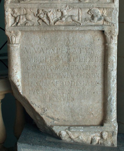 - D(is) M(anibus) / M(arcus) Val(erius) Speratus / vet(eranus) leg(ionis) VII Cl(audiae) ex b(ene)f(iciario) / co(n)s(ularis) dec(urio) m(unicipii) A(eli) V(iminacii) praef(ectus) coh(ortis) / I Aquet(anorum)! v(ixit) a(nnos) LV o(biit) in Brit{t}(annia) / Lucia Afrodisia con/iugi b(ene) m(erenti) et sibi vivae / posuit
