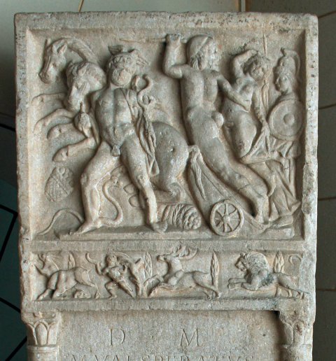Mythos. Stele mit horizontalem Abschluss. Oben einfach gerahmtes Bildfeld mit Raub der Proserpina, vor den Pferden Mercur, rechts im Hintergrund Minerva.