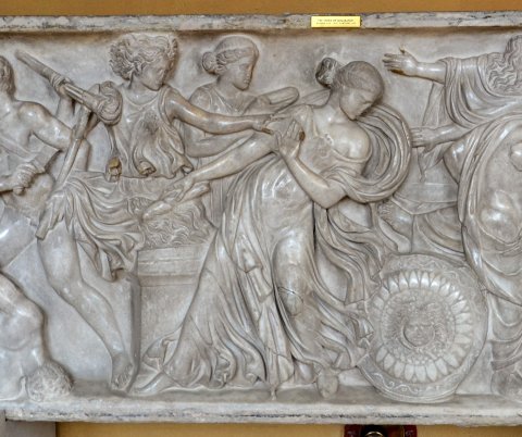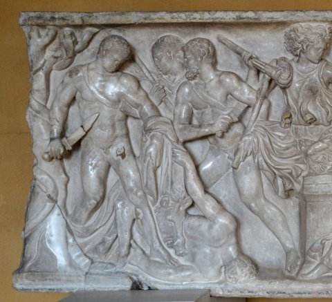 - Mythos: links unter einem Baum mit Schlange Meleager über der Leiche eines Onkels, über dem Arm die Haut des Ebers. Der zweite Onkel eilt mit Schwert und Speer heran. In der Mitte Altar, auf dem Althaia das Holzscheit verbrennt, hinter dem Altar die Personifikation des Fatum und eine Furie. Rechts Totenbett des Meleager mit Trauernden (ganz rechts Atalante); die Waffen des Heroen liegen vorn am Boden.