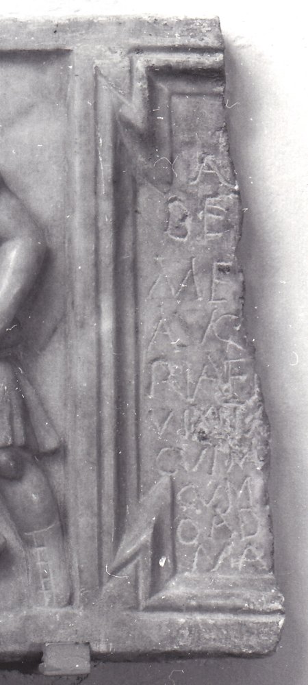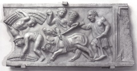 - Getreideernte (zwei Männer im Lendenschurz tragen Ährenbündel) und Pflüger mit Ochsengespann, dahinter Jüngling mit Korb für die Aussaat. Rechts Rest einer tabula ansatsa mit Inschrift.