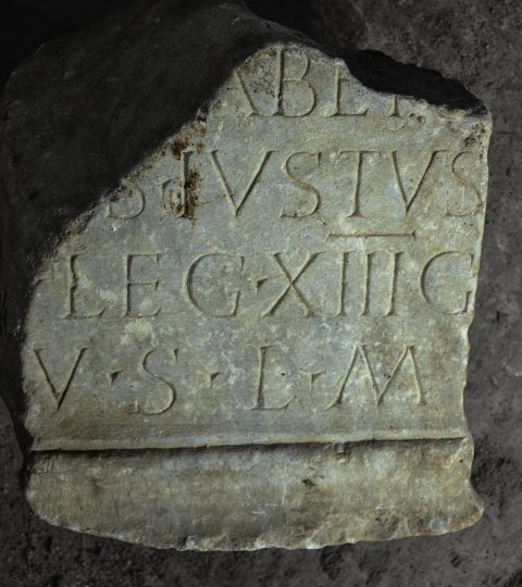 - [------] / [C(aius) L]aber[i]/[u]s Iustus / [|(centurio)] leg(ionis) XIII G(eminae) / v(otum) s(olvit) l(ibens) m(erito)