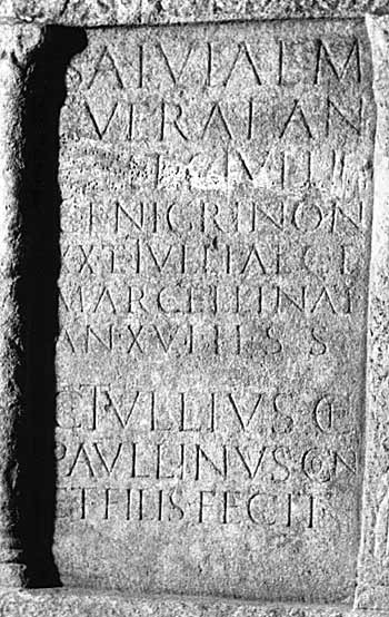 - Salviae M(arci) / f(iliae) Verae an(norum) / [XX]X et C(aio) Tullio / C(ai) f(ilio) Nigrino an(norum) / XX et Tulliae C(ai) f(iliae) / Marcellinae / an(norum) XVI h(ic) s(iti) s(unt) / C(aius) Tullius C(ai) f(ilius) / Paullinus con(iugi) / et fili(i)s fecit