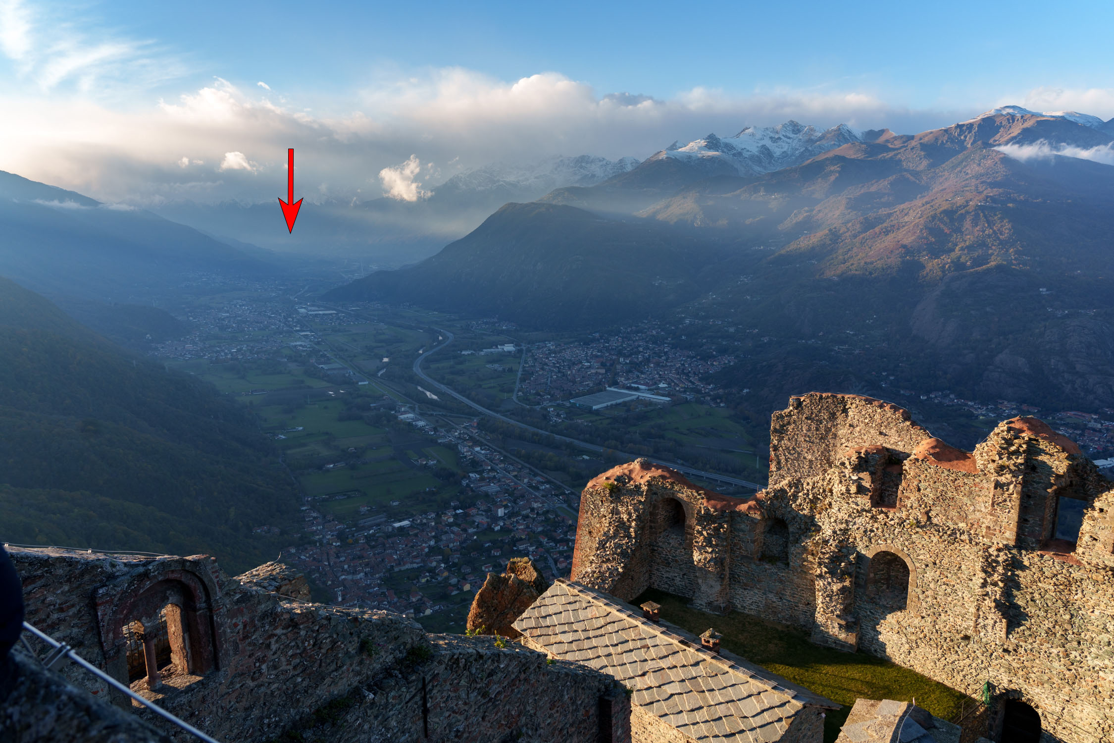 Blick vom Kloster Sacra di San Michele (972 m) die Dora Riparia flussaufwärts in Richtung Susa (Pfeil)
