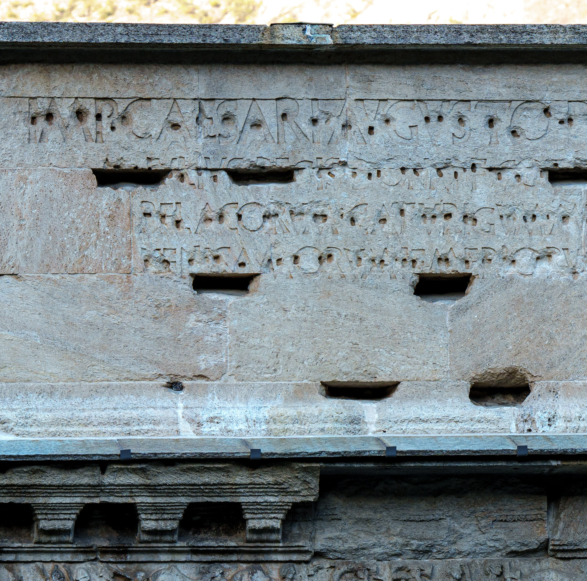 33277 Inschrift auf der Südseite der Attika des Augustusbogens
