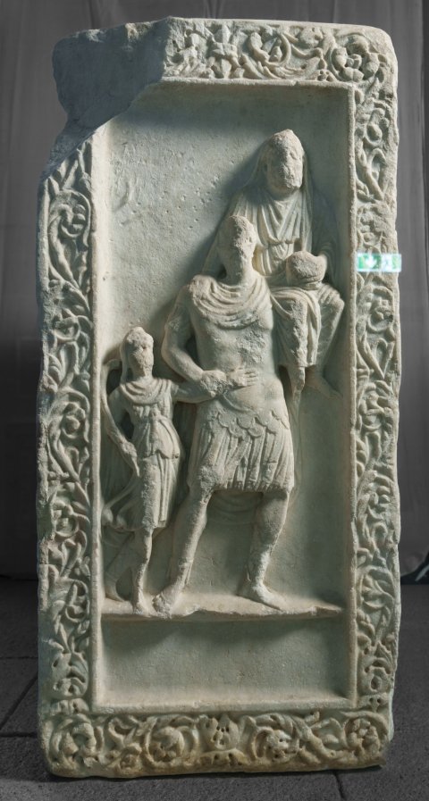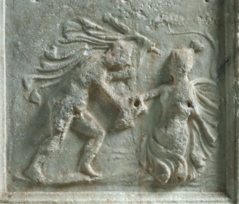 Linke Nebenseite: Flucht des Aeneas mit Anchises auf dem linken Arm und Askanius an der rechten Hand. Aeneas in Panzer, Anchises mit Penatenschrein auf dem Schoß, Askanius mit phrygischer Haube, kurzem gegürteten Gewand und Mantel, im rechten Arm Pedum (?). Rahmenleiste mit Akanthusranke.