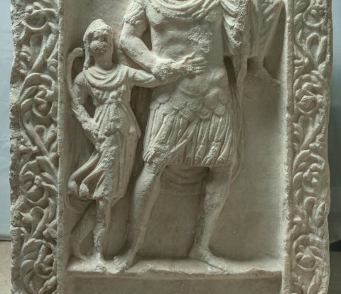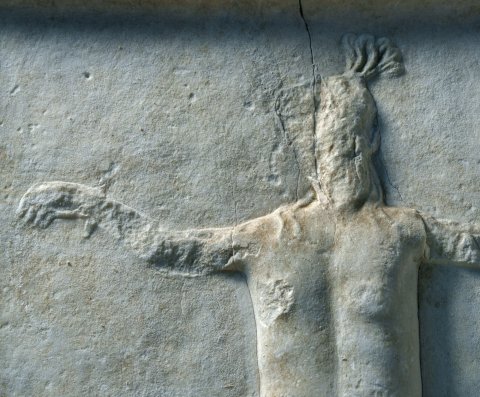 - verrieben, Reliefteile u. obere linke Ecke der linken Nebenseite abgebr.