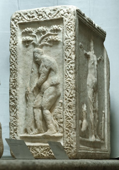 Rechte Nebenseite: bärtiger Hercules umfasst mit beiden Händen den Stamm eines Baumes, neben ihm liegen Löwenfell und Keule. Rahmenleiste mit Akanthusranke.