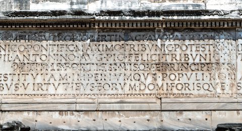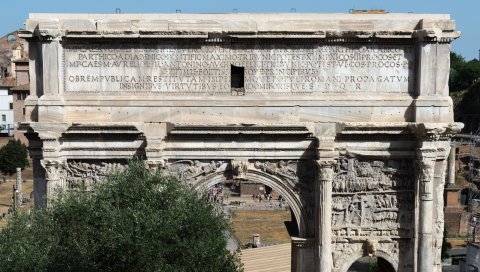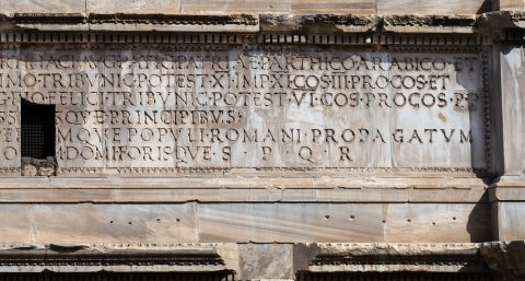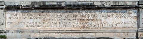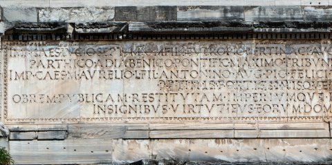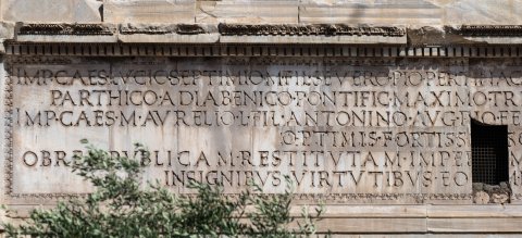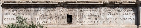 - Imp(eratori) Caes(ari) Lucio Septimio M(arci) fil(io) Severo Pio Pertinaci Aug(usto) patri patriae Parthico Arabico et / Parthico Adiabenico pontific(i) maximo tribunic(ia) potest(ate) XI imp(eratori) XI co(n)s(uli) III proco(n)s(uli) et / Imp(eratori) Caes(ari) M(arco) Aurelio L(uci) fil(io) Antonino Aug(usto) Pio Felici tribunic(ia) potest(ate) VI co(n)s(uli) proco(n)s(uli) p(atri) p(atriae) et / [[[P(ublio) Septimio Getae nobiliss(imo) Caesari]]] / «optimis fortissimisque principibus» / ob rem publicam restitutam imperiumque populi Romani propagatum / insignibus virtutibus eorum domi forisque s(enatus) p(opulus)q(ue) R(omanus)