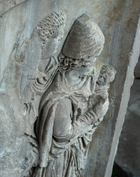- Auf der Vorderseite gefangener Barbar in Hosen und phrygischer Mütze, der ein Kleinkind auf dem Arm trägt. Weiter links Reliefreste von zwei römischen Soldasten und eines zweiten Barbaren. Auf beiden Nebenseiten jeweils ein Soldat, der einen Gefangenen vor sich an der Kette führt.