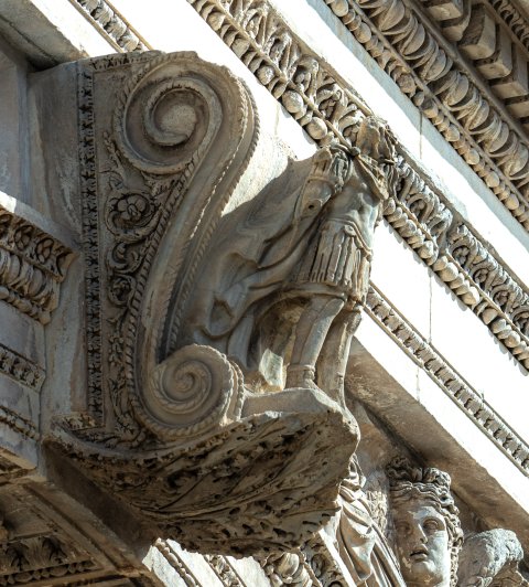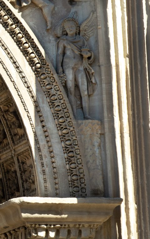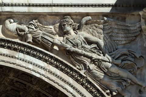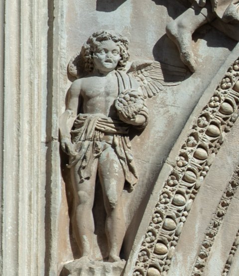 - Schwebende Victorien mit Tropaia, unterhalb ihrer Füße je eine geflügelte kindliche Jahreszeitenpersonifikation (Sommer und Herbst). Auf dem Schlussstein des Bogens stehender Mars im Panzer, im linken Arm Tropaion.