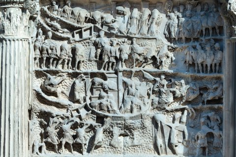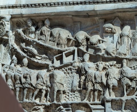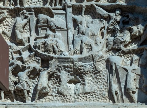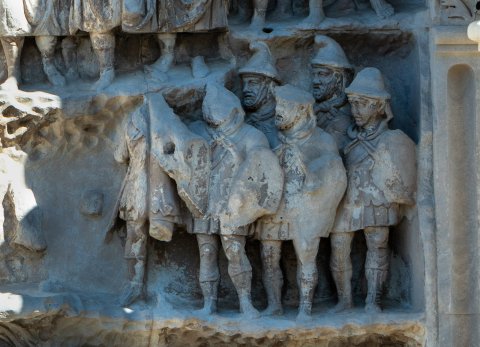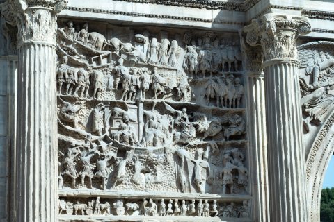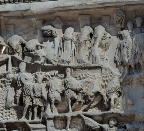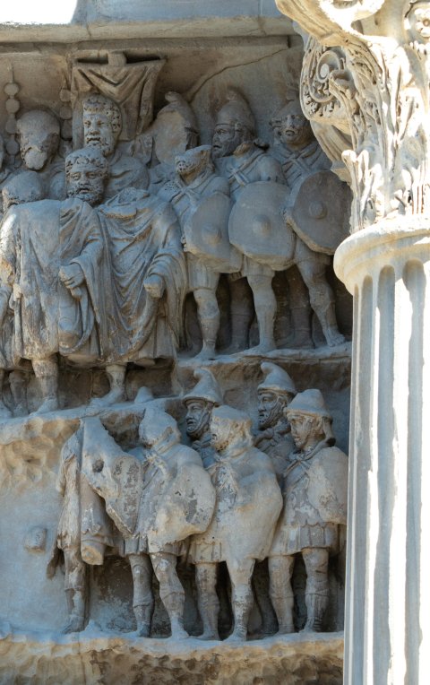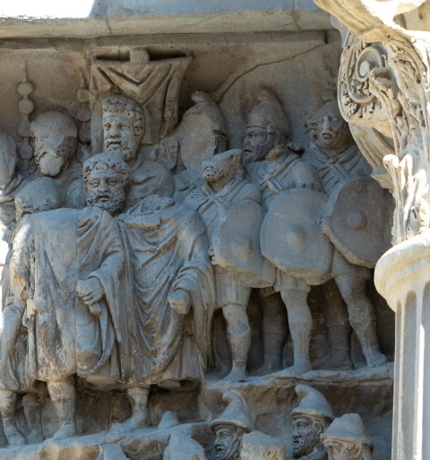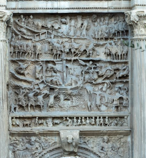 Unter dem großen Relief Fries mit Karren mit Beute, rechts thronende Dea Roma, vor die Gefangene geführt werden.