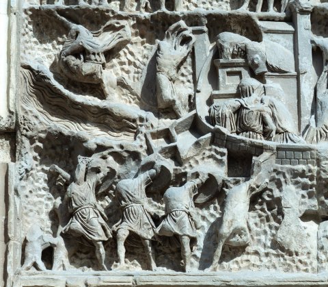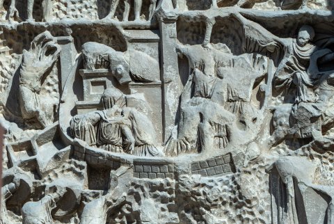 Angriff auf Seleukia am Tigris im 2. Partherfeldzug. Bildfolge in mehreren Registern. Unten Wurfgeschosse abwehrende Soldaten, darüber in der Mitte Festung am Fluss, rechts und links Reiterei; darüber römische Soldaten und sich ergebende Parther; ganz oben in der Mitte Stadtmauern und Türme, davor drei weibliche Figuren (Gottheiten ?), links aus dem Stadttor ziehende Gefangene, rechts Kaiser und Gefolge.