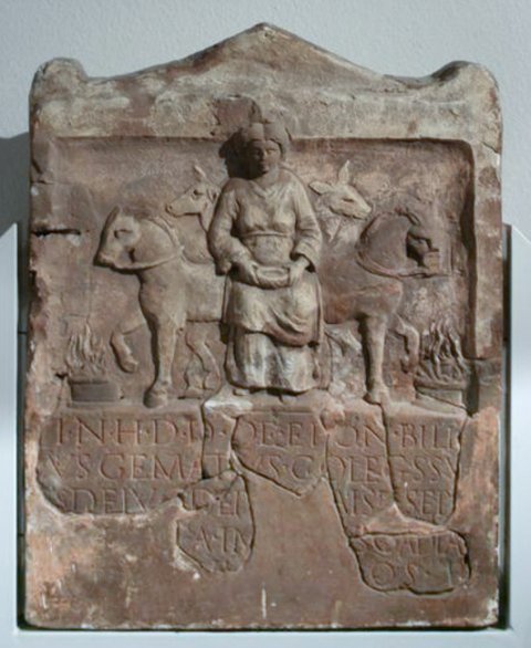 - Mythische Figur: Epona frontal sitzend, Schale in den Händen, hinter ihr zu beiden Seiten gezäumtes Pferd, darüber Köpfe von zwei weiteren Tieren. Vor den Pferden je ein Altar mit Opferfeuer.