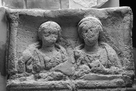 Im Hauptbild zwischen Säulen mit Blattschuppen und Spiralkanneluren drei Brustbilder einer Familie. Links Frau: Tunica, Umhang. In der Mitte Kind. Rechts einheimische Frau: Haube, Tunica, Umhang.